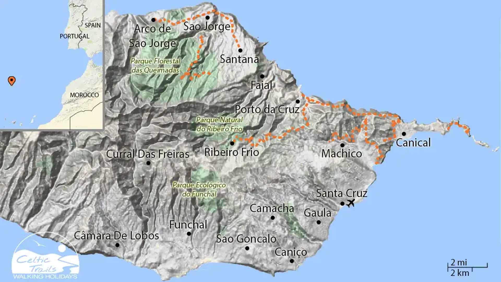 From the port of Machico, your holiday starts by following your first of the island’s characteristic levadas, before walking around the green coastline of the São Lourenço Peninsula. From here, the route becomes more challenging in nature as you follow the Levada do Caniçal up to the Boca de Risco viewpoint where you’ll catch panoramic views over the rugged Atlantic coastline, before reaching the small coastal community of Porto da Cruz. Following the Levada do Furado, your path then takes you though the UNESCO protected laurissilva forest, where the path inclines to take you to a viewing point over the coast and forest, before taking you back down to sea-level. From the Parque Florestal das Queimadas your route takes you along the Levada do Caldeirão Verde to reach a waterfall and the traditional village of Ilha. Your final day of walking will see you walk part of the Caminho Real which encircles the island, on your way from Santana to Arco de São Jorge.